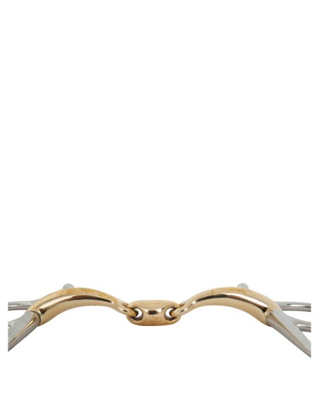Deze kwalitatief hoogwaardige dubbel gebroken kneveltrens, met losse scharen, is vervaardigd van massief Cuprigan met roestvrijstalen ringen en scharen. Cuprigan is een legering bestaande uit 89% koper, 7% aluminium, 3% ijzer en 1% zink Het oxidatieproces van het materiaal geeft een prettige geur en smaak. De anatomische vormgeving volgt de vorm van de paardenmond, waardoor een zachte en gelijkmatige drukverdeling ontstaat. Door de combinatie van de vormgeving en de unieke samenstelling van Cuprigan, wordt het kauwproces en de speekselvorming gestimuleerd, waardoor er een fijne verbinding kan ontstaan met de gevoelige paardenmond. Het bit heeft een normale inwerking op de mond. Het mondstuk heeft een dikte van 14 mm en de scharen hebben een lengte van 127 mm.