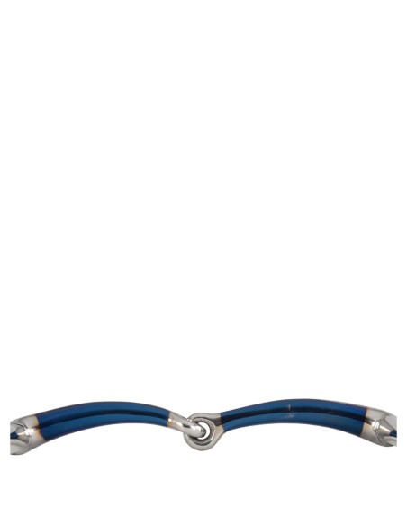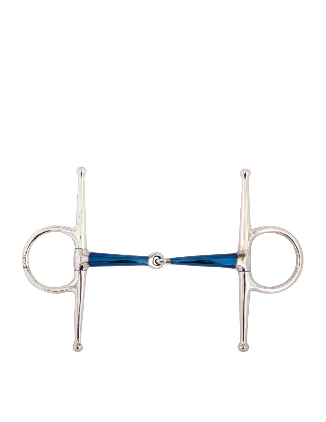 Deze enkel gebroken kneveltrens is vervaardigd van massief roestvrij stalen ringen en een zacht stalen mondstuk gecombineerd met een sweet iron laagje op het mondstuk (blauw). De sweet iron coating op het mondstuk stimuleert de aanmaak van speeksel. Wanneer dit materiaal reageert met vocht, warmte en lucht zal het oxideren en een zoet smakende oppervlakteroest ontwikkelen. Dit helpt bij de acceptatie van het bit. Uiteindelijk verdwijnt de blauwe kleur, maar de smaak van het oppervlakteroest blijft.