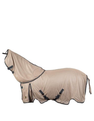 Deze vliegendeken is vervaardigd van een soepele kwaliteit polyester mesh. Dit fijnmazige materiaal biedt uitstekende bescherming tegen vliegen en andere insecten. Bij de borst is de deken verstevigd met een extra laag polyester mesh en bij de manen heeft de deken een gladde voering van 190T nylon. Het afneembare halsdeel heeft twee klittenbandsluitingen aan de voorkant en drie elastische riempjes aan de bovenkant voor de bevestiging van een halster. Het halsdeel kan eenvoudig aan de D-ringen van de deken bevestigd worden met behulp van drie elastische riempjes met quick release clips en klittenband. De buiksingel is extra verstevigd dankzij de Pu patch van synthetisch leder. De deken is voorzien van een verstelbare, enkele borstsluiting met een quick release clip en een brede klittenbandsluiting. Daarnaast heeft de deken een bies over de rugnaad en een fleece schoftbeschermer. Verder is de deken voorzien van loopsplitten; kruissingels met elastiek die zowel verstelbaar als afneembaar zijn en verstelbare, afneembare, elastische bilkoorden. De extra gevormde onderlijn zorgt voor een optimale bescherming van de buik. De brede staartflap is aan de binnenkant voorzien van een elastische lus waar de staart doorheen gehaald kan worden en daarnaast heeft de deken ook een staartkoord. De deken is uitgerust met fournituren van zink met een matte, zilverkleurige finish. Machinewasbaar op 30°C.