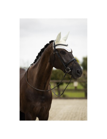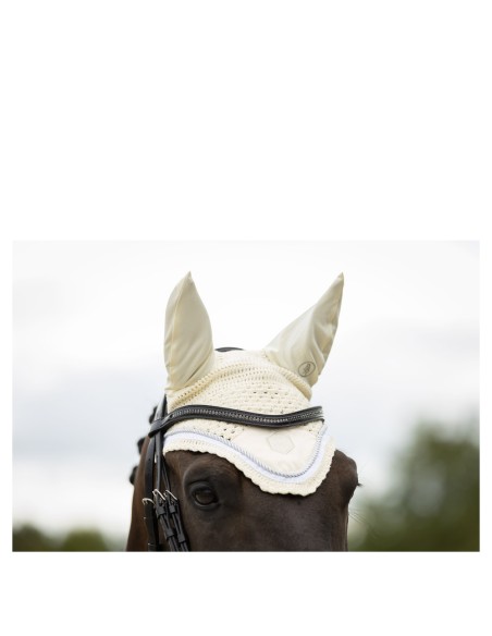 De oren passen dankzij het soepele, stretchy lycramateriaal perfect om de oren van het paard. Het oornetje is geheel in dezelfde stijl als de zadeldekken afgewerkt met een inzetstuk van satijn, een subtiel glanzende bies met visgraatmotief en een zilveren koordbies.