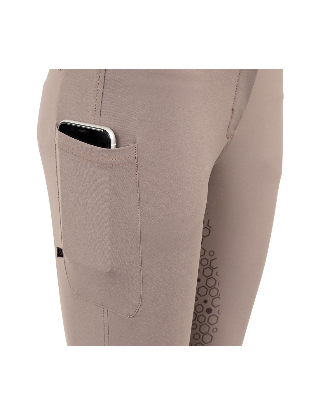 Op het rechterbeen bevindt zich een diepe zak die perfect geschikt is om een mobiele telefoon in te doen. Daarnaast heeft de rijbroek twee jeanszakken aan de voorkant en twee ritszakken aan de achterkant. De stretch tailleband met riemlussen en elastische beensluiting zorgen voor een mooie, nauwsluitende pasvorm. Het siliconen zitvlak met grafisch patroon zorgt voor een stabiele zit.