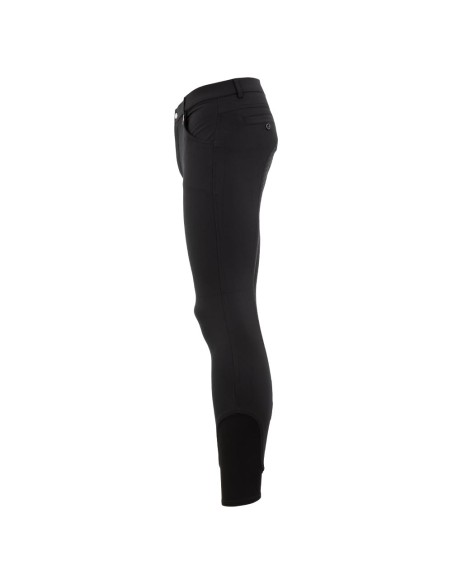 Deze heren rijbroek met klassieke uitstraling bevat een siliconen zitvlak voor extra grip en een stabielere zit. De rijbroek is voorzien van twee steekzakken aan de voorkant en twee paspelzakken aan de achterkant. De voorzakken kunnen gesloten worden met behulp van een drukknopje aan de binnenkant en ook de achterzakken zijn voorzien van een knoopje.
