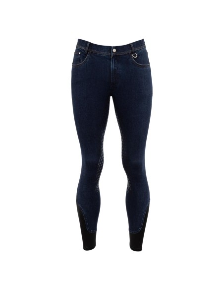 Deze stijlvolle, donkere jeans rijbroek is gemaakt van een comfortabele 4-way stretchstof en gedecoreerd met okerkleurig contraststiksel.