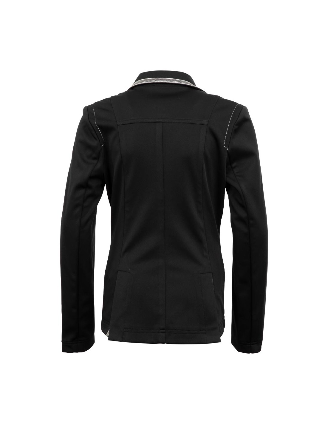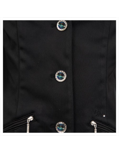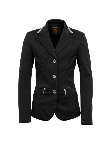 De wedstrijdjas is voorzien van drie fonkelende kunststof BR knopen. Deze knopen zijn voorzien van een glanzend ruitpatroontje dat, afhankelijk van het licht, van kleur verandert. Zowel de kraag als de twee rijsplitten op de achterkant zijn verfraaid met een opvallende zilveren bies met glittereffect. Het geborduurde BR-logo met strasssteentje boven de rechter zak en de subtiele zilveren sierstiksels bij de schouders maken het geheel af.