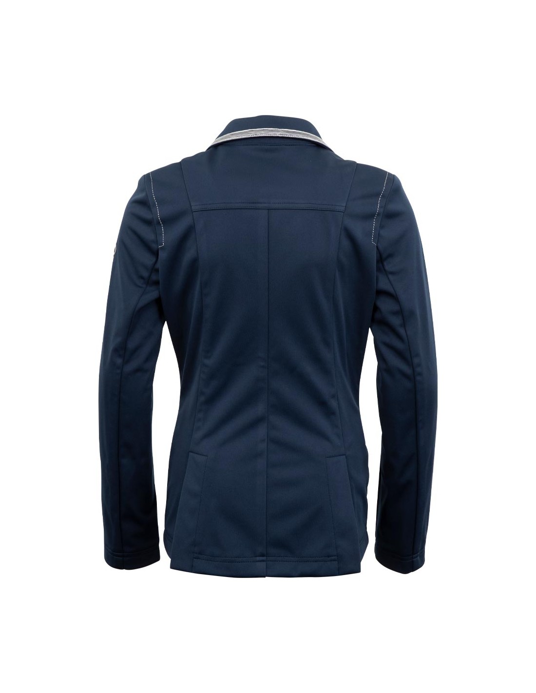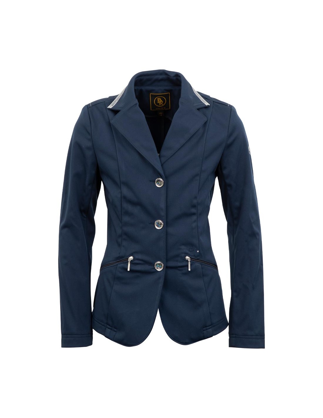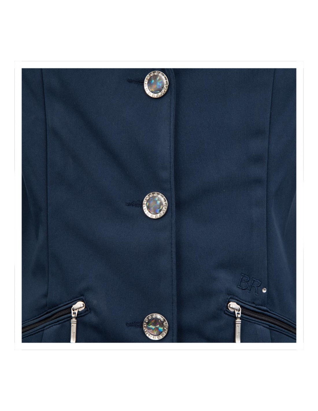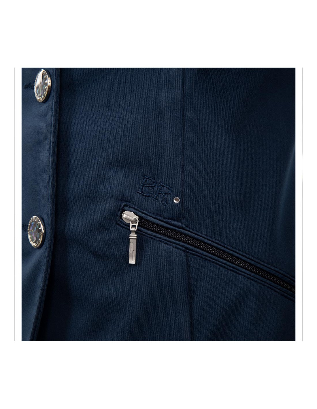 De wedstrijdjas is voorzien van drie fonkelende kunststof BR knopen. Deze knopen zijn voorzien van een glanzend ruitpatroontje dat, afhankelijk van het licht, van kleur verandert. Zowel de kraag als de twee rijsplitten op de achterkant zijn verfraaid met een opvallende zilveren bies met glittereffect. Het geborduurde BR-logo met strasssteentje boven de rechter zak en de subtiele zilveren sierstiksels bij de schouders maken het geheel af.