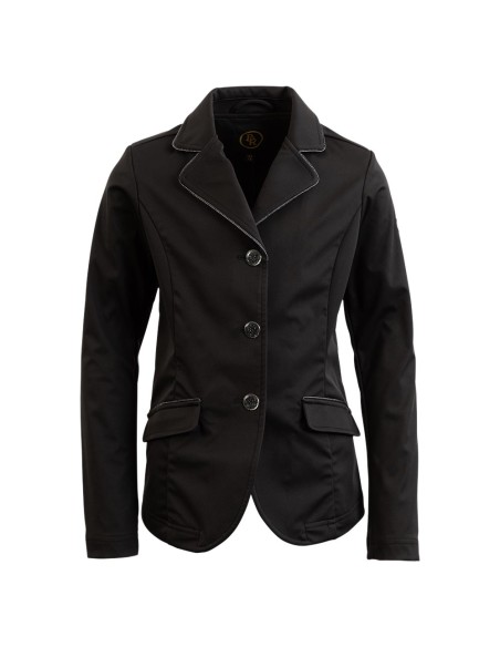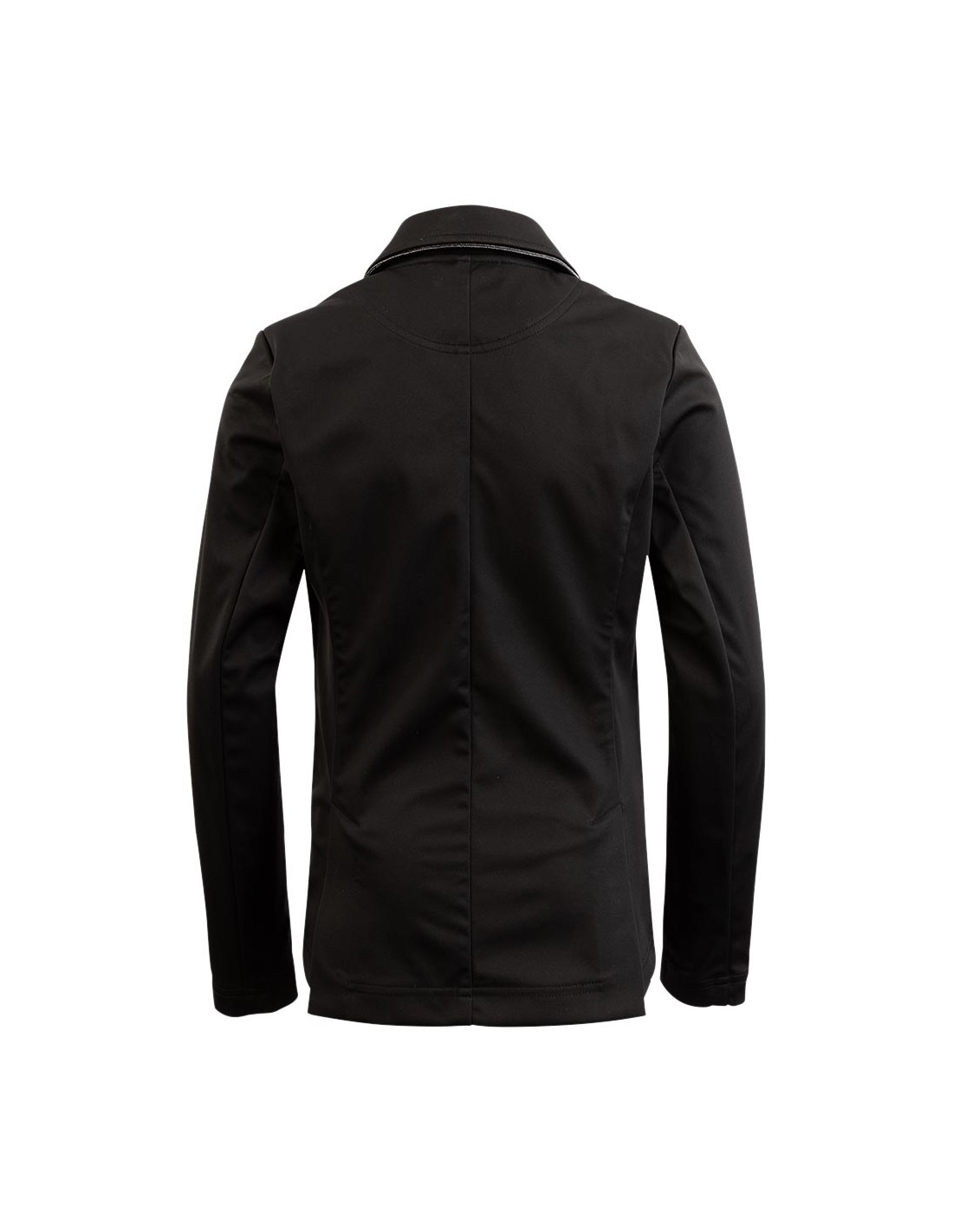 Deze mooie wedstrijdjas voor kinderen is niet alleen prettig om te dragen, maar ziet er ook nog eens stijlvol uit vanwege de zwart-glanzende biezen langs de kraag en boven de zakken en de zwarte glitterknopen.