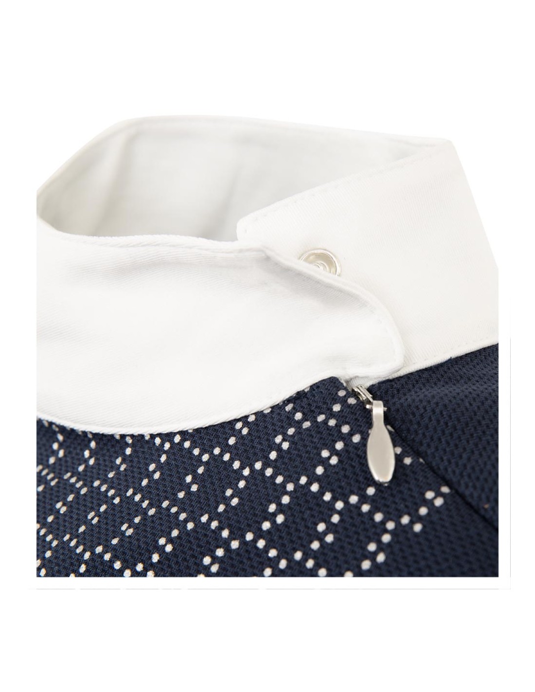 Het shirt bevat een kraagje met twee onzichtbare drukknopjes en er loopt nog een rits vanaf de kraag richting de linkermouw. Het zilveren, glanzende patroon onder de kraag en de zilveren BR-logo’s maken de elegante look van dit shirt af.