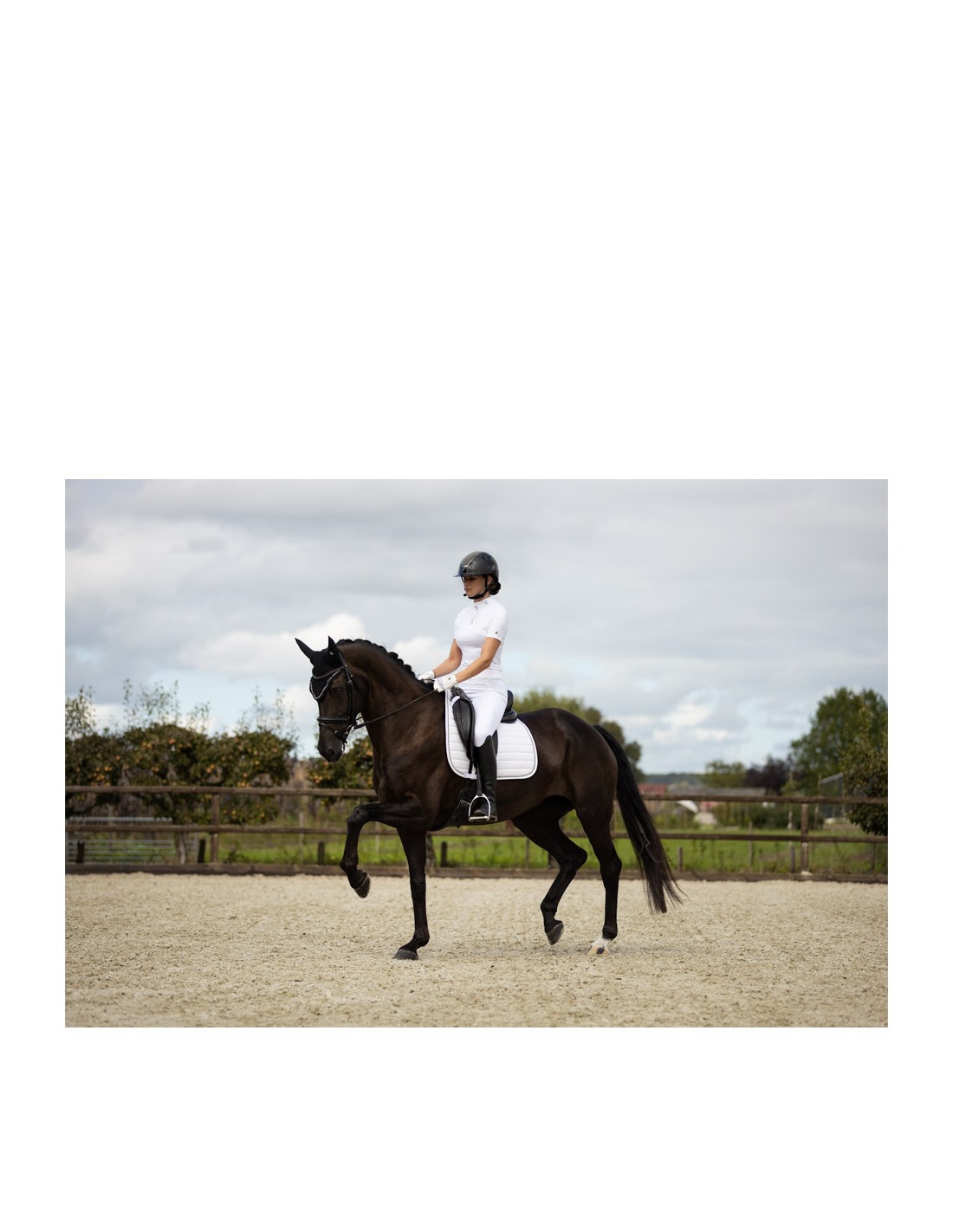 Dit elegante wedstrijdshirt valt op door de zilveren details zoals de rits en de mooie, hoge kraag. De stof is vochtregulerend en sneldrogend wat het draagcomfort optimaal maakt. Omdat het een stretchshirt is, heeft het een prettige, nauwsluitende pasvorm. De rits is voorzien van een ritsbeschermer. De zilveren flatlockstiksels en BR-logo's op de mouw en kraag maken het wedstrijdshirt op stijlvolle wijze af.