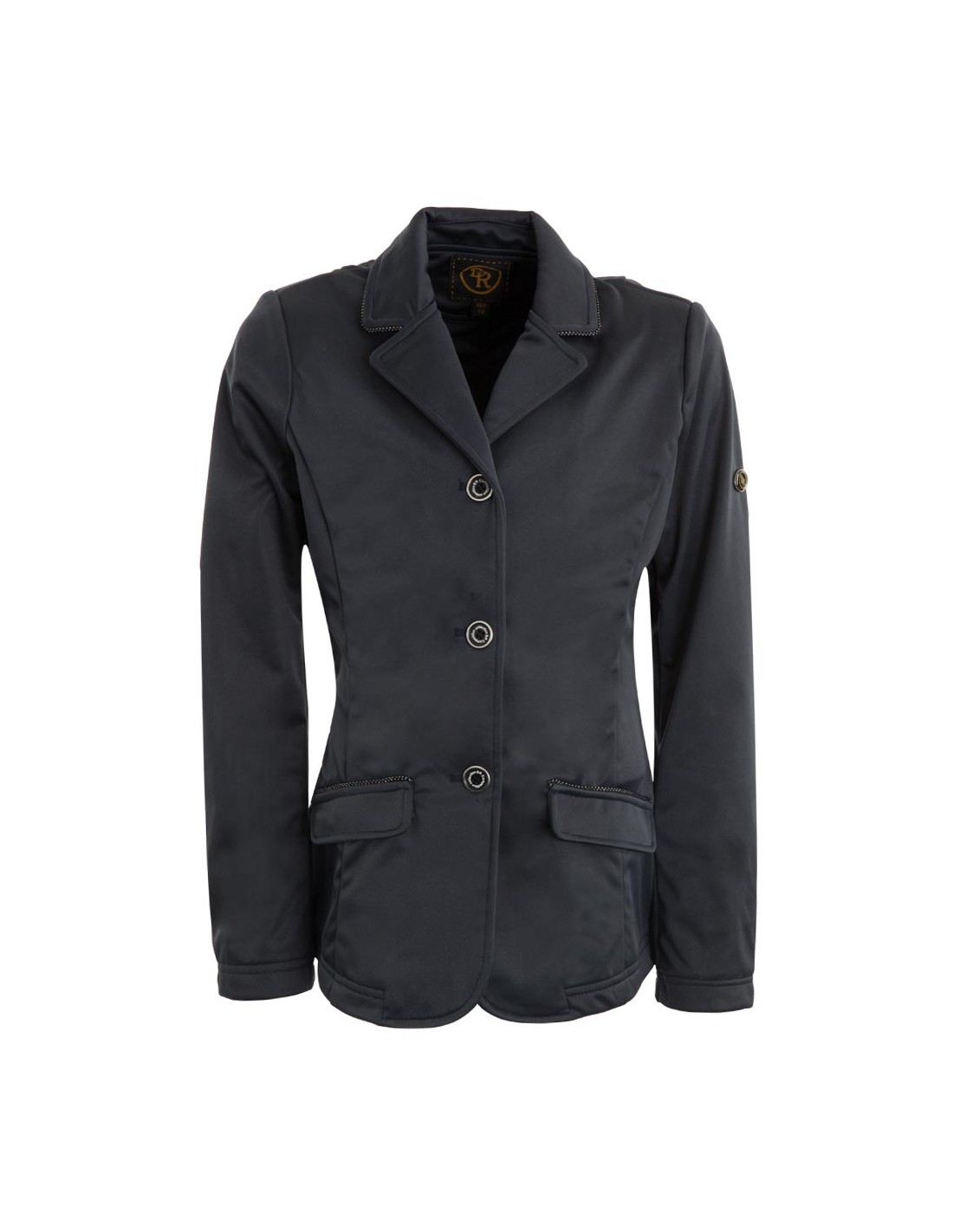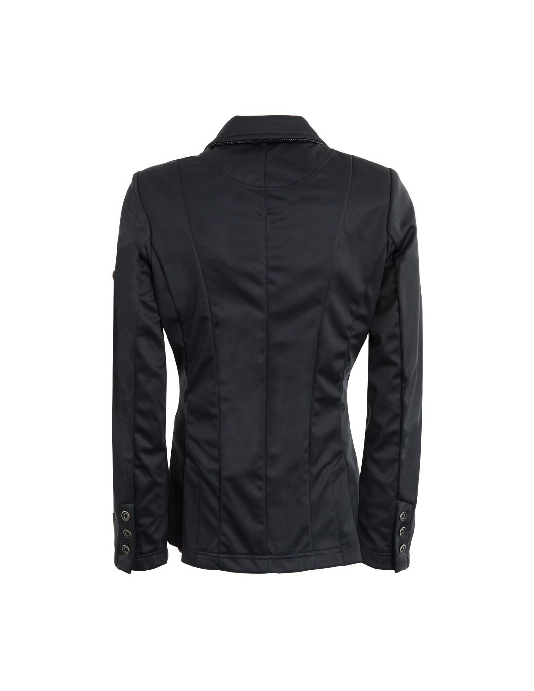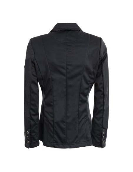 Getailleerd model wedstrijdjas van 100% polyester soft shell. Dit comfortabele materiaal is waterafstotend, rekbaar en licht. Op het voorpand is de jas voorzien van drie kunststof BR knopen. De manchetten zijn voorzien van dezelfde knopen in een kleiner formaat. Zowel de klepzakken als de kraag zijn afgewerkt met sierkoord met een subtiel zilverkleurig detail. Opvallend aan het jasje is de elegante belijning aan de achterzijde, die de taille extra accentueert. De mouwen hebben een comfortabele pasvorm. De jas is voorzien van twee rijsplitten aan de achterkant. Machinewasbaar op 30°C.