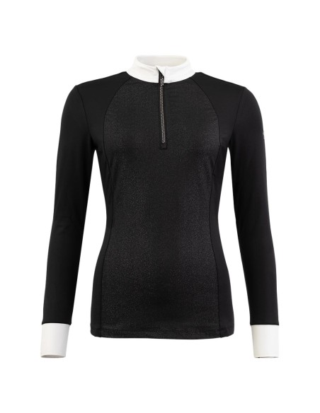 Dit elegante wedstrijdshirt laat je stralen tijdens je wedstrijden. Het shirt met lange mouwen is aan de voorzijde voorzien van een subtiele glitterprint en is afgewerkt met strass-steentjes langs de halflange rits. De halflange voorrits is voorzien van een ritsbeschermer en op de linkermouw bevindt zich een sierlijk zilver-metalkleurig BR-logo. Het shirt voelt soepel aan en daarnaast is de stof sneldrogend en vochtregulerend zodat je je droog en fris blijft voelen tijdens het dragen.