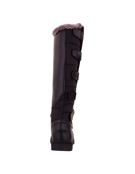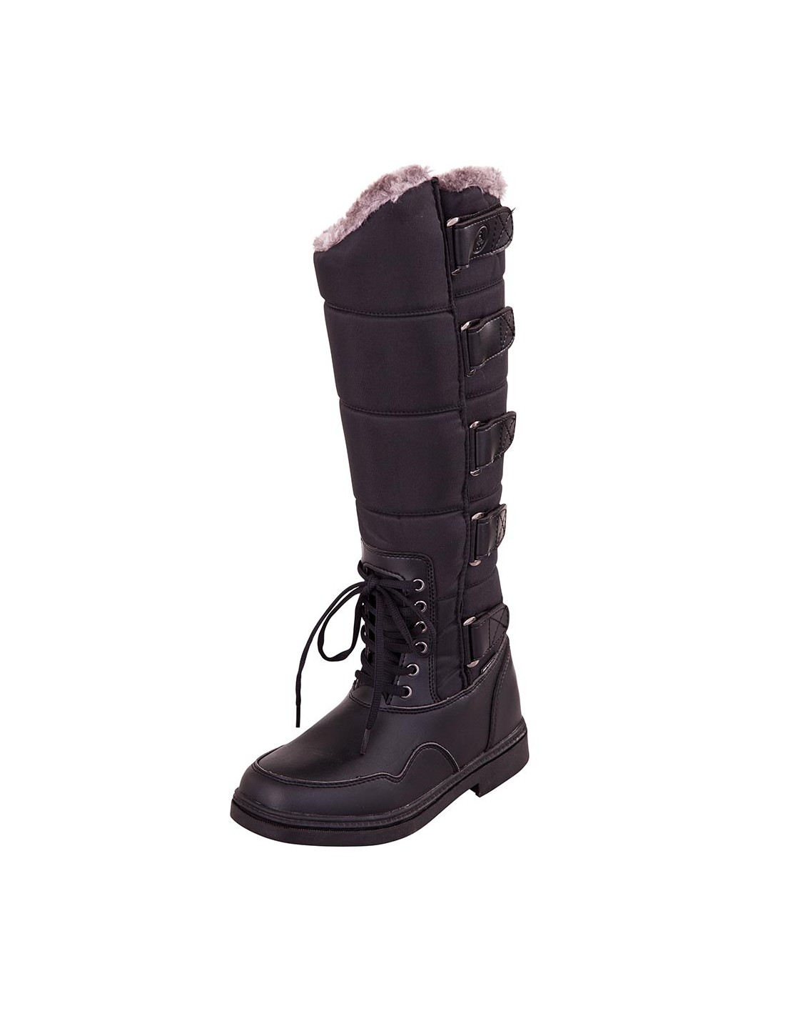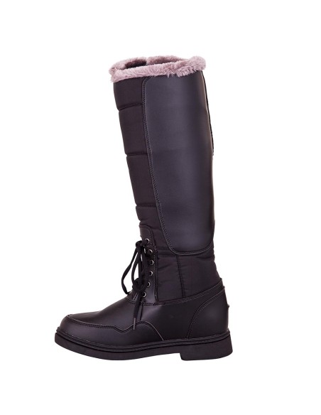 Modieuze winterrijlaars met vetersluiting en een synthetische bontrand aan de bovenzijde. De voet is van microfiber polyurethaan en is daardoor waterafstotend, net als de schacht van Cordura en polyurethaan. De laars sluit mooi aan om het been door de klittenbandsluitingen. De laars heeft een synthetische bontvoering en een isolerende laag voor extra warmte. Verder heeft de laars een rubberen zool en een voorgevormd voetbed met een stalen cambreur die zorgt voor goede stabiliteit. Echt een fijne, warme laars voor in en om stal en om mee te rijden in de winter.